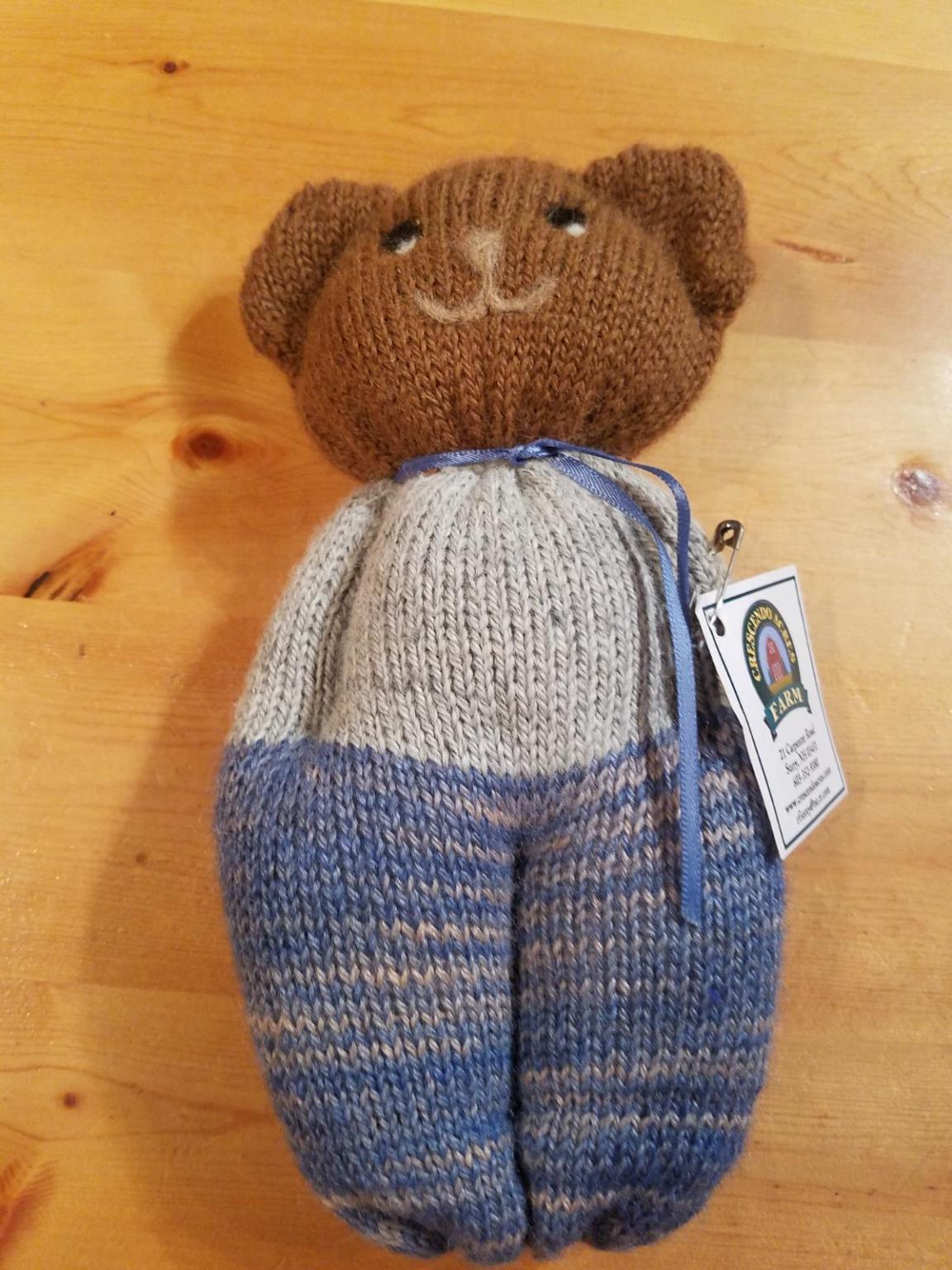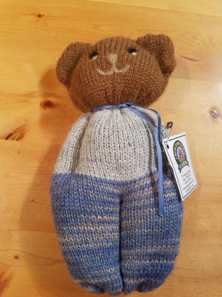 This 100% alpaca teddy is made on a machine that was built in 1903. It is made from our own alpaca yarn and hand dyed. Colors vary as hand made. Approximate height 8″.