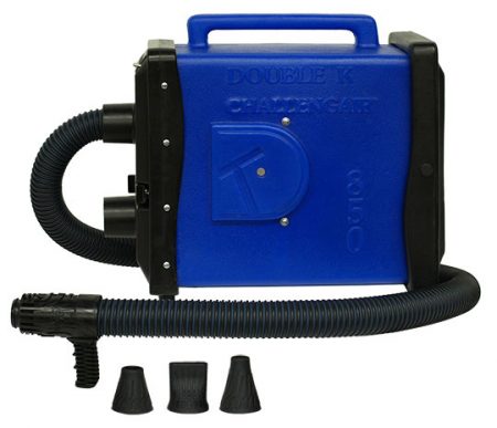 The Double K CHALLENGAIR™ 850™ High Velocity Dryer is the most effective and versatile dryer on the market. The CHALLENGAIR™ 850™ has no heating element due to the “flo‑thru” motor configuration. The air is warmed by the operational heat of the motor, which saves electricity and produces heat up to 45 degrees above room temperature.